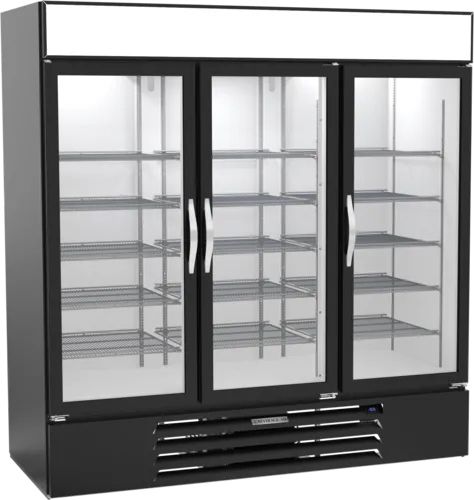 The freezer features three triple-pane hinged glass doors, providing excellent insulation while maximizing product visibility. The doors are designed for ease of access and energy efficiency. -