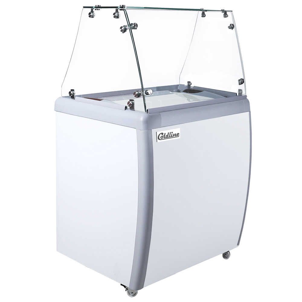 The Coldline DP-160-FSG Ice Cream Dipping Cabinet Freezer is an ideal choice for businesses that need a compact yet efficient solution to showcase and store ice cream. This 26-inch freezer features a clear flat-front sneeze guard, ensuring hygiene while providing a professional and attractive display. It accommodates up to 4 tubs for serving and 2 tubs for storage, making it perfect for smaller ice cream shops, cafés, and dessert stands.