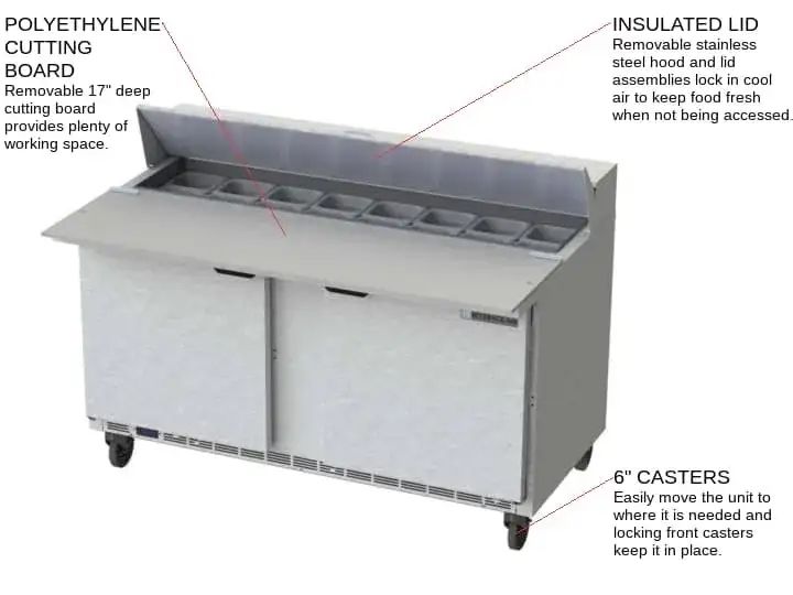 The Beverage Air SPE60HC-16C is an excellent choice for commercial kitchens requiring a balance of storage capacity, efficient prep features, and durability. The 17" cutting board and ample pan space make it ideal for versatile sandwich and salad preparation.