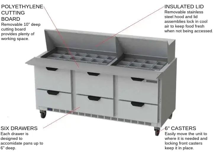 The Beverage Air SPED72HC-30M-6 Mega Top Refrigerated Prep Table is an excellent solution for high-volume commercial kitchens, offering ample storage and a well-designed workspace for efficient food preparation. Its durable design, energy-efficient refrigeration system, and convenient drawer configuration make it a valuable addition to any professional kitchen.