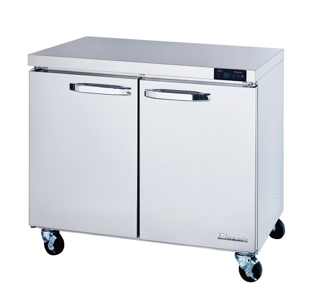 Blue Air BLUR36-HC, 36-inch 2 Swing Doors Undercounter Refrigerator, 9.2 Cu. Ft. has stainless steel interior and exterior and equipped with epoxy coated wire shelves with adjustable shelving height. This unit is designed to accept full size roll-in racks for bun sheet pan (18"Lx26"D).