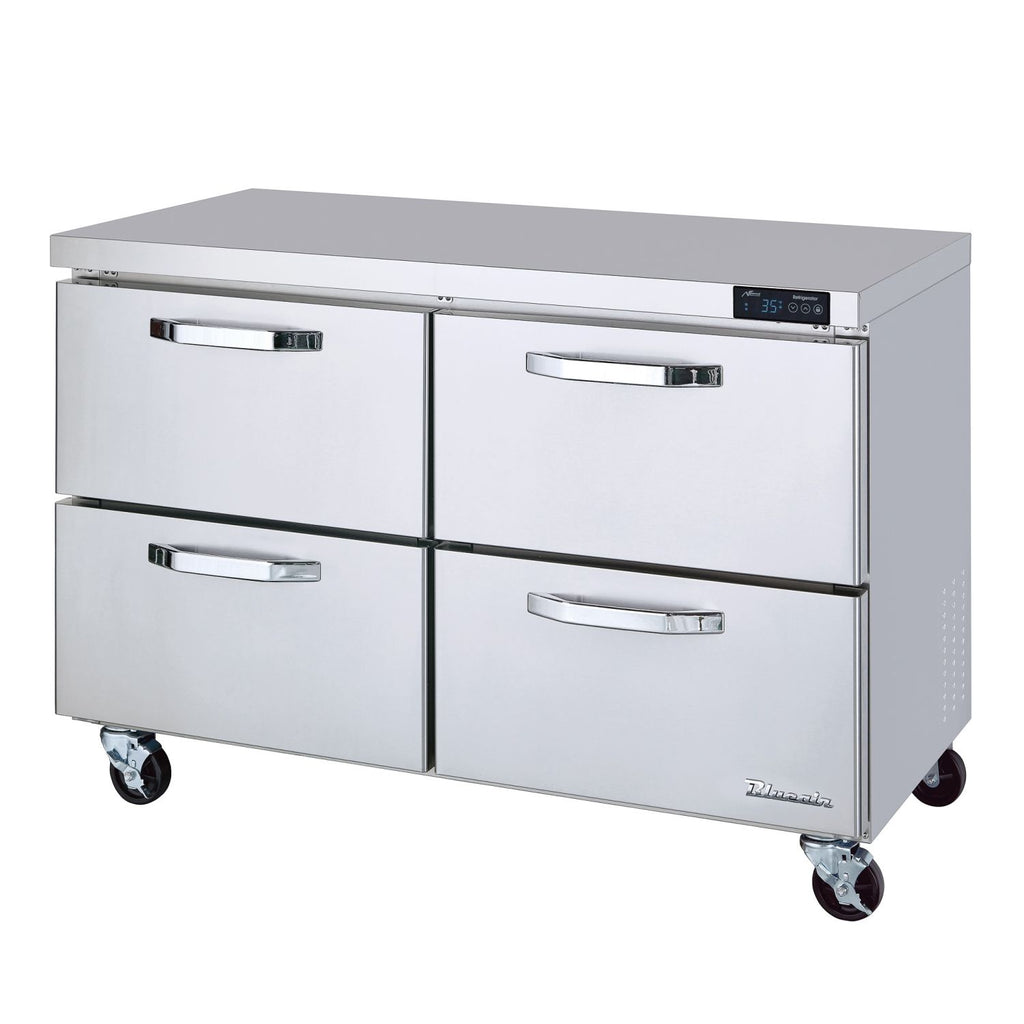 The Blue Air BLUR48-D4-HC is a top-tier 48-inch 4 Drawers Undercounter Refrigerator that boasts a sleek stainless steel interior and exterior, providing durability and easy maintenance. Equipped with corrosion-resistant shelves, it ensures long-lasting storage solutions for your refrigerated items. This unit is specially designed to accommodate full-size roll-in racks for bun sheet pans (18"L x 26"D), making it ideal for high-volume kitchens.