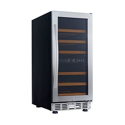 - With its stainless steel door and black finish, this wine cabinet complements any setting while saving valuable space.