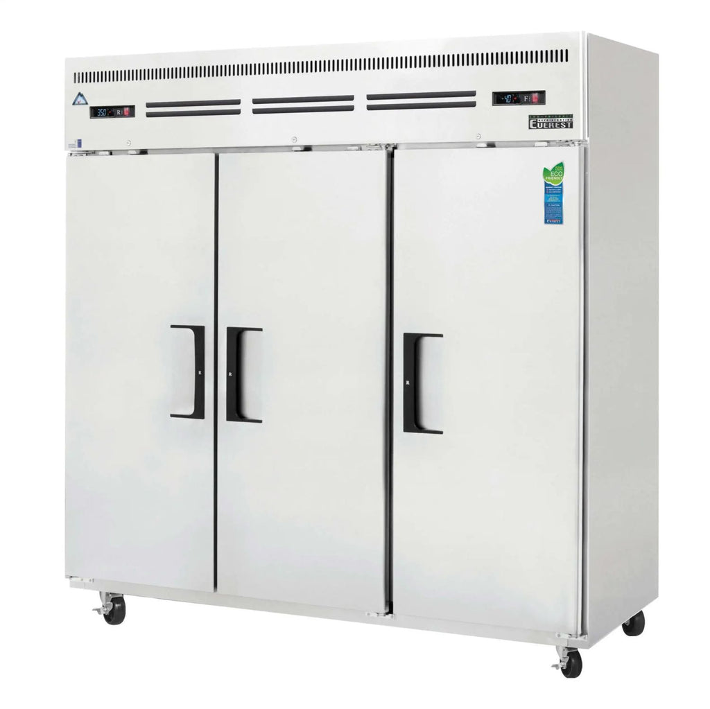 The Everest Refrigeration ESRF3 is a three-section Reach-In Refrigerator/Freezer Combo designed to offer expansive storage with dual-temperature functionality. This unit is perfect for high-demand commercial kitchens, foodservice operations, and storage environments that need to store both frozen and refrigerated items simultaneously.