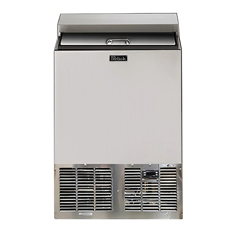 The Perlick FR24RT-SS-STK Glass Froster is an underbar unit with a 24" width. It features self-contained refrigeration and operates within a temperature range of -10°F to 10°F. The unit offers an interior volume of 4.2 cu.ft. and includes a dent-resistant stainless steel sliding door with a die-cast handle. Other features include front venting, manual defrost, and a self-evaporating condensing pan for efficient operation. It is constructed from stainless steel inside and out, operates on R290 refrigerant, and is powered by a 1/4 HP motor with 120v/60/1-ph, drawing 3.8 amps. A 6' cord and NEMA 5-15P plug are included. This unit meets NSF and cULus standards.