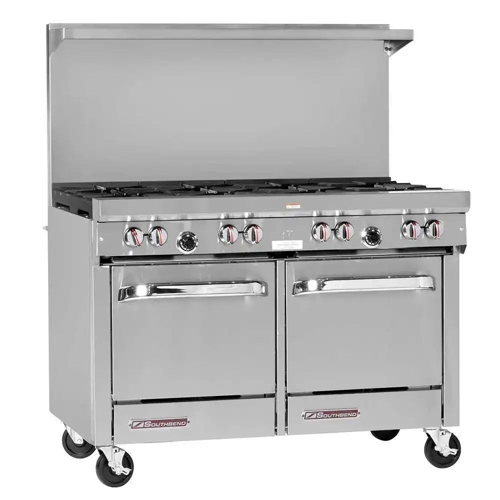 The Southbend S48EE Gas Restaurant Range is a robust and efficient gas range ideal for high-volume commercial kitchens, featuring multiple burners and ovens to handle a variety of cooking tasks.