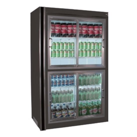 - Four durable glass doors with handles for easy access and improved product visibility.