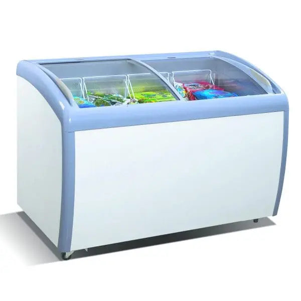 Angle Curved Top Chest Freezer, 9.2 cu. ft., tempered glass arc sliding lid with lock, temperature range -10° to -1°F, white epoxy coated basket, white coated steel exterior, white coated aluminum interior, defrost drain, self-contained refrigeration, 2″ casters, 115v/60/1-ph, 215 watts, cETLus, ETL-Sanitation