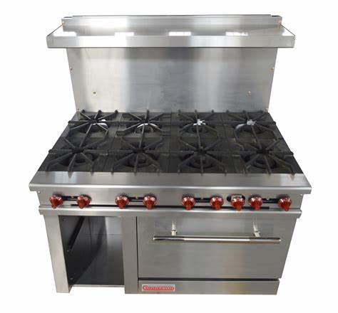 The Connerton CN48-8 Restaurant Range is a powerful and versatile cooking solution designed for demanding professional kitchens. This 48-inch wide, gas-powered range features eight open top burners, each generating an impressive 34,000 BTUs of heat, ensuring even and efficient cooking for a variety of dishes. Durable cast iron grates provide a stable surface for pots and pans, while the flash tube pilot system ensures quick and reliable ignition. The Bake-n-Roast oven, boasting a substantial 35,000 BTU output, provides ample space and heat for baking and roasting tasks. A single oven rack with three adjustable positions allows for flexible configuration, while the crumb tray simplifies cleaning. The range boasts a sleek and durable stainless steel construction, including the front, sides, riser, and lift-off high shelf, ensuring long-lasting performance and easy maintenance. Adjustable 6-inch legs provide stability and allow for precise leveling. With a total BTU output of 307,000, the CN48-8 is a powerful workhorse, capable of handling the demands of busy restaurants. The range also meets rigorous NSF and CSA STAR standards, ensuring safety and quality in commercial kitchens.
