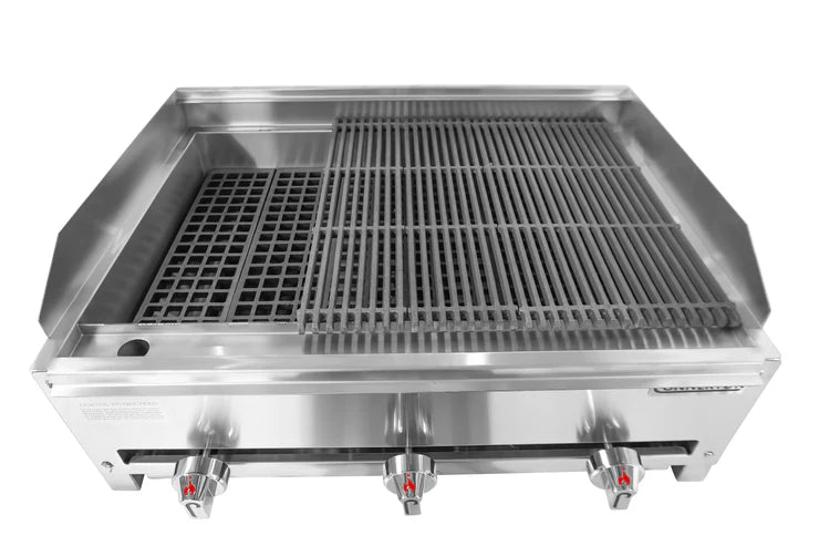 Charbroiler, countertop, gas, 32"W x 23"D, lava-rock with cast iron bottom grates, cast iron top grates with rear height adjustment, manual controls, 3/4" NPT rear gas connection, fully welded stainless steel body, fire box, front & drip pan, 84,000 BTU, NSF, CSA