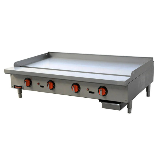 The Sierra Range SRTG-48E is a 48 wide professional electric griddle with a 1" thick highly polished steel griddle plates, four elements. This thermostat griddle also features 4" stainless steel adjustable legs, 5.7" landing edge for increase plate stability, removable grease tray with weep hole, and a 4"wide grease trough for easier cleaning. The rugged stainless steel exterior body is easy to clean and protects the unit from rust and corrosion. The SRTG-48E is also designed with aeration baffles that provide uniform surface temperatures across the unit for added convenience. If you are looking for a superior 4-element countertop griddle to suit the requirements of your facility, the SRTG-48E is a great product choice. At Kitchenall Commercial Foodservice Supply, we deliver the SRTG-48E at wholesale pricing to locations within the US and Canada. One year parts and labor warranty is available with prompt shipping out of our New York warehouses.