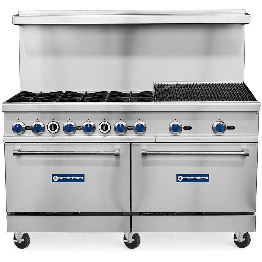 Standard Range SR-R60-24CB, 60-Inch Commercial Gas Range with 24-Inch Charbroiler, 6 Burners, 2 Ovens