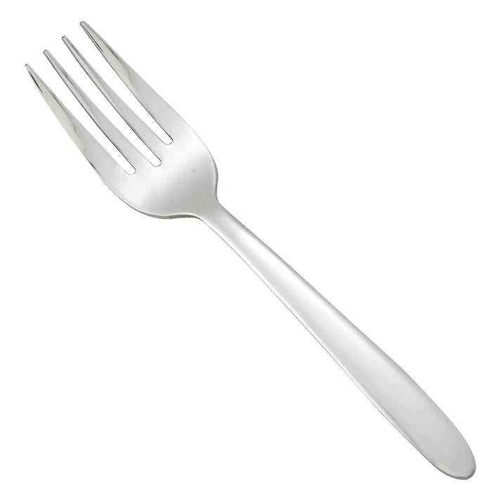 Create an elevated table setting with this commercial-grade 7" salad fork, part of the Flute flatware collection by Winco. This specially designed salad fork features wide tines to provide additional leverage for cutting and spearing large vegetables and leafy greens. The Flute flatware collection features elongated oval handles with a smooth finish for a minimal yet modern silhouette that compliments any tabletop. Forged from heavy-duty stainless steel, this heavyweight salad fork is designed to withstand daily use in a commercial foodservice environment making it an ideal choice for hotels, cafes and restaurants. Each piece of the Flute flatware collection is dishwasher safe for both residential and commercial dishwashers. The elegant mirror finish is designed to last and is resistant to pitting or dulling, even after repeated washes.