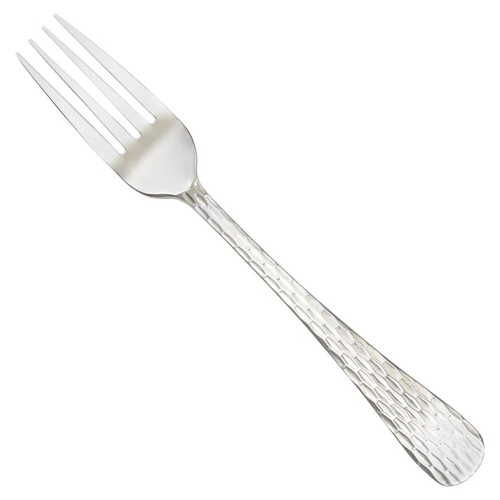 Create an elevated table setting with this commercial-grade 7.25" salad fork, part of the Caspian flatware collection by Winco. This specially designed salad fork features wide tines to provide additional leverage for cutting and spearing large vegetables and leafy greens. The Caspian pattern invites light to dance across the hammered ripples, a versatile choice for any setting. Forged from stainless steel, this medium weight salad fork is designed to withstand daily use in a commercial foodservice environment making it an ideal choice for hotels, cafes and restaurants. Each piece of the Caspian flatware collection is dishwasher safe for both residential and commercial dishwashers.