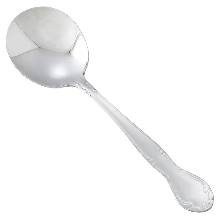 Create an elevated table setting with this commercial-grade 6.75" bouillon spoon, part of the Elegance flatware collection by Winco. This bouillon spoon features a shallow bowl designed to contour the interior of a soup bowl making this an ideal spoon for soups, broths and side dishes. The Elegance flatware collection features embossed floral embellishments with a single motif at the handle tip adding a modern touch to traditional flatware patterns. Forged from heavy-duty stainless steel, this heavyweight bouillon spoon is designed to withstand daily use in a commercial foodservice environment making it an ideal choice for hotels, cafes and restaurants. Each piece of the Elegance flatware collection is dishwasher safe for both residential and commercial dishwashers. The elegant mirror finish is designed to last and is resistant to pitting or dulling, even after repeated washes.