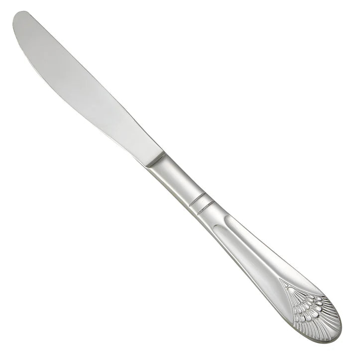Create an elevated table setting with this commercial-grade 9.75" table knife, part of the Peacock flatware collection by Winco. This versatile table knife is ideal for main courses or as a general purpose knife for main courses, salads and desserts. The Peacock flatware collection features a flared handle and sculpted detailing on the handle that blends seamlessly into any elaborate place setting. Forged from heavy-duty stainless steel, this heavyweight table knife is designed to withstand daily use in a commercial foodservice environment making it an ideal choice for hotels, cafes and restaurants. Each piece of the Peacock flatware collection is dishwasher safe for both residential and commercial dishwashers. The elegant mirror finish is designed to last and is resistant to pitting or dulling, even after repeated washes.