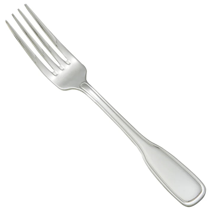 Create an elevated table setting with this commercial-grade 7.5" salad fork, part of the Oxford flatware collection by Winco. This specially designed salad fork features wide tines to provide additional leverage for cutting and spearing large vegetables and leafy greens. The Oxford flatware collection features a fiddle-shaped handle with subtle grooves that lend a touch of old-fashioned elegance to any setting. Forged from heavy-duty stainless steel, this heavyweight salad fork is designed to withstand daily use in a commercial foodservice environment making it an ideal choice for hotels, cafes and restaurants. Each piece of the Oxford flatware collection is dishwasher safe for both residential and commercial dishwashers. The elegant mirror finish is designed to last and is resistant to pitting or dulling, even after repeated washes.