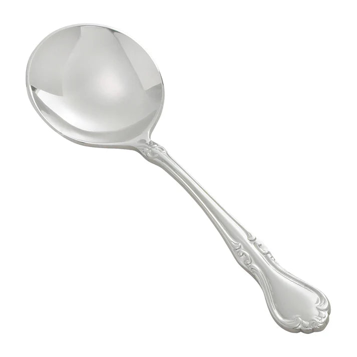 Create an elevated table setting with this commercial-grade 6" bouillon spoon, part of the Chantelle flatware collection by Winco. This bouillon spoon features a shallow bowl designed to contour the interior of a soup bowl making this an ideal spoon for soups, broths and side dishes. Inspired by the Regency era, the Chantelle flatware collection by Winco features delicate flourished lines adding a traditional touch to any table. Forged from extra heavy-duty 18/8 stainless steel, this heavyweight bouillon spoon features a mirrored finish and is designed to withstand daily use in a commercial foodservice environment making it an ideal choice for hotels, cafes and restaurants. Each piece of the Chantelle flatware collection is dishwasher safe for both residential and commercial dishwashers. The elegant mirror finish is designed to last and is resistant to pitting or dulling, even after repeated washes.